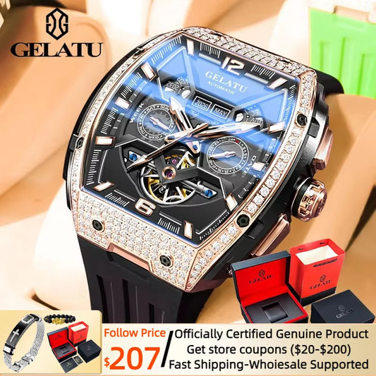 GELATU Full Diamond Men'S Watches Flywheel Design Dual Calendar Automatic Mechanical Watch for Men TOP Brand Original Wristwatch
